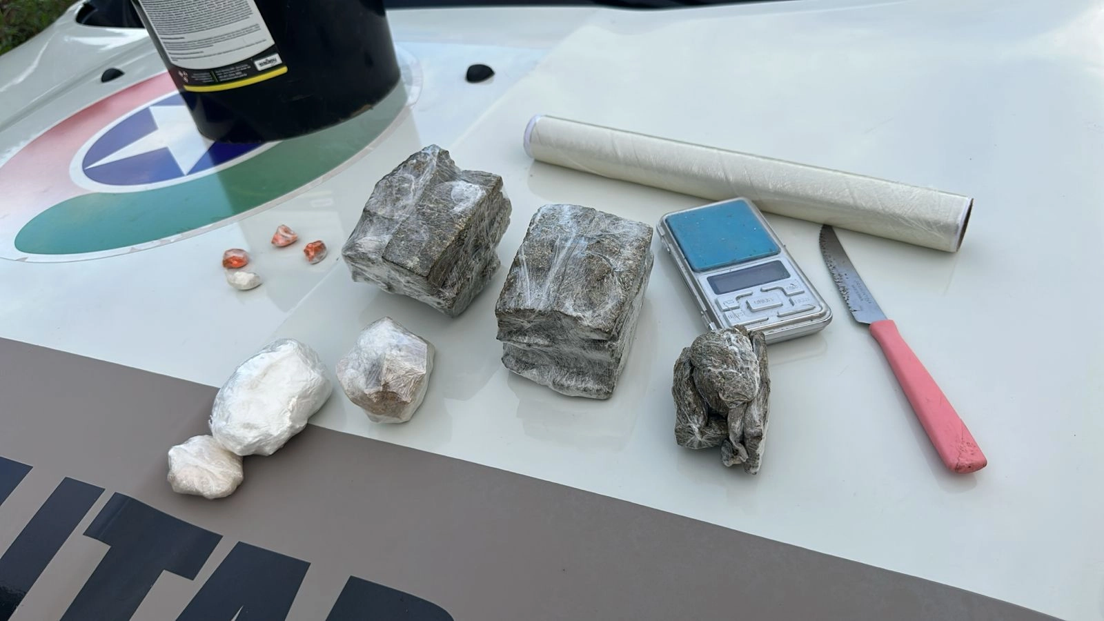 Na casa, os policiais encontraram uma faca usada para fracionar drogas, uma balança de precisão e diversas substâncias ilícitas, totalizando: