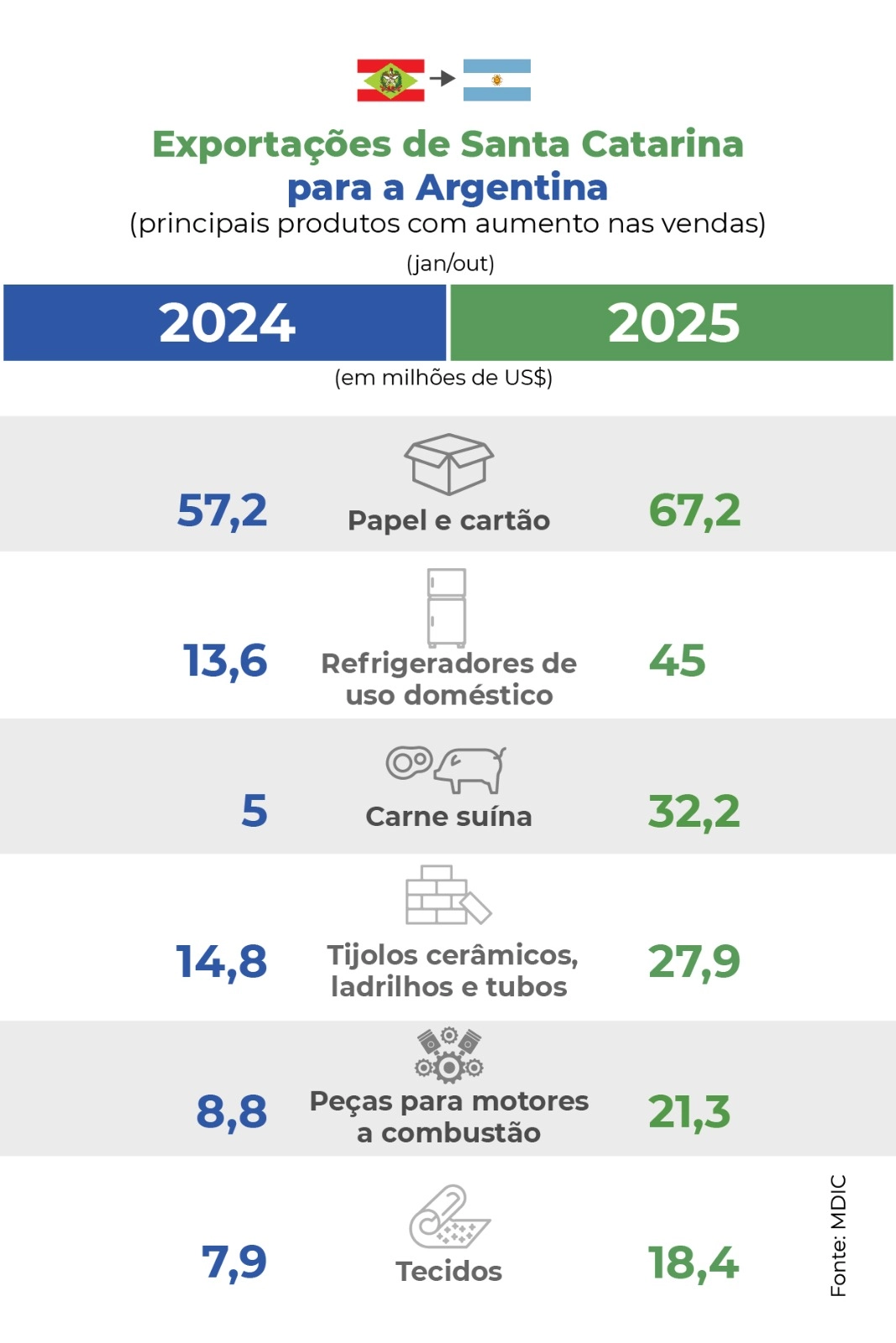 As exportações de Santa Catarina para a Argentina cresceram 25% entre janeiro e outubro de 2025, passando de US$ 595 milhões em 2024 para US$ 746 milhões em 2025. O resultado foi impulsionado principalmente pelo aumento das vendas de produtos industrializados.