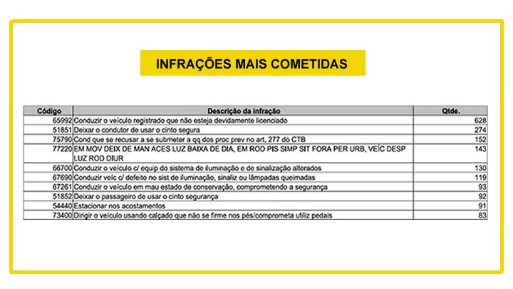 Entre as infrações mais registradas, destacam-se: conduzir veículo sem licenciamento (628 autuações), não usar cinto de segurança (274) e recusa ao teste do etilômetro (152).